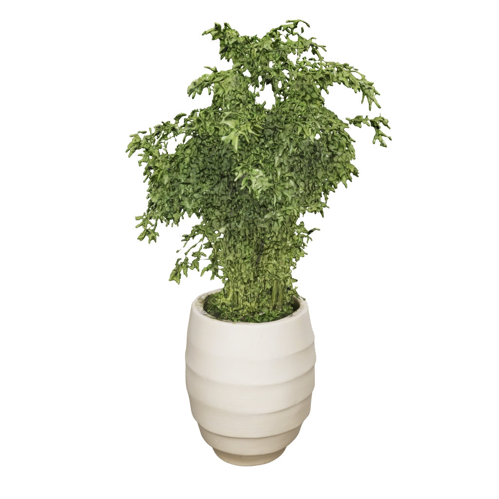 De Polyscias Hawaiiana Ming heeft een verfijnde, compacte groei met fijn vertakte bladeren die samen een rustig en verzorgd silhouet vormen. De plant oogt licht en elegant, maar heeft tegelijkertijd een duidelijke aanwezigheid. Een subtiele balans tussen zachtheid en structuur.
